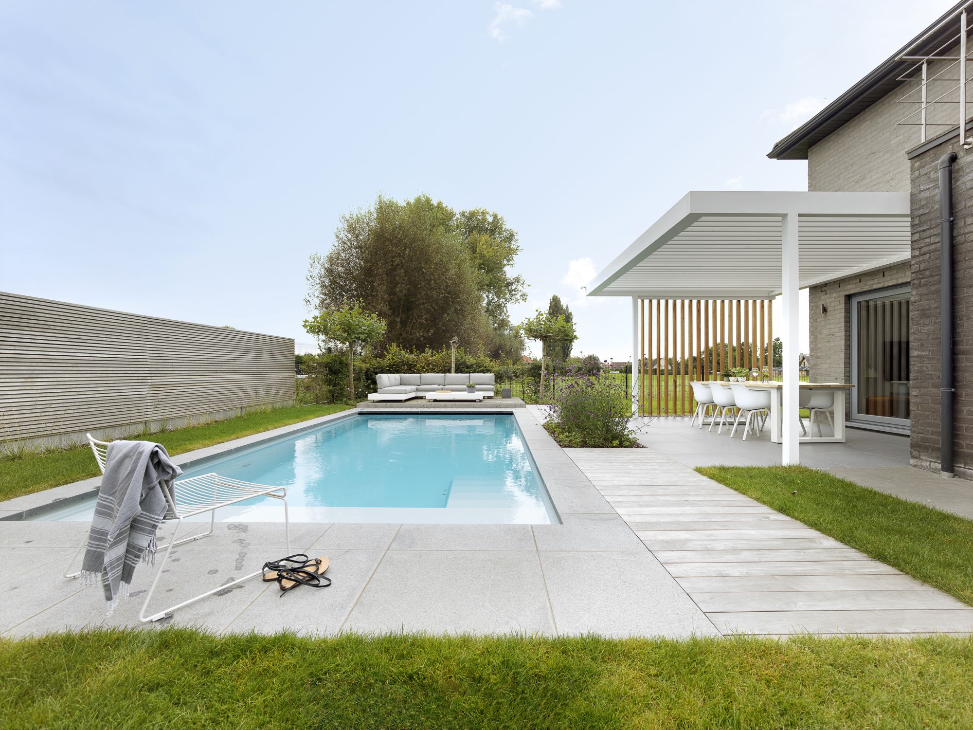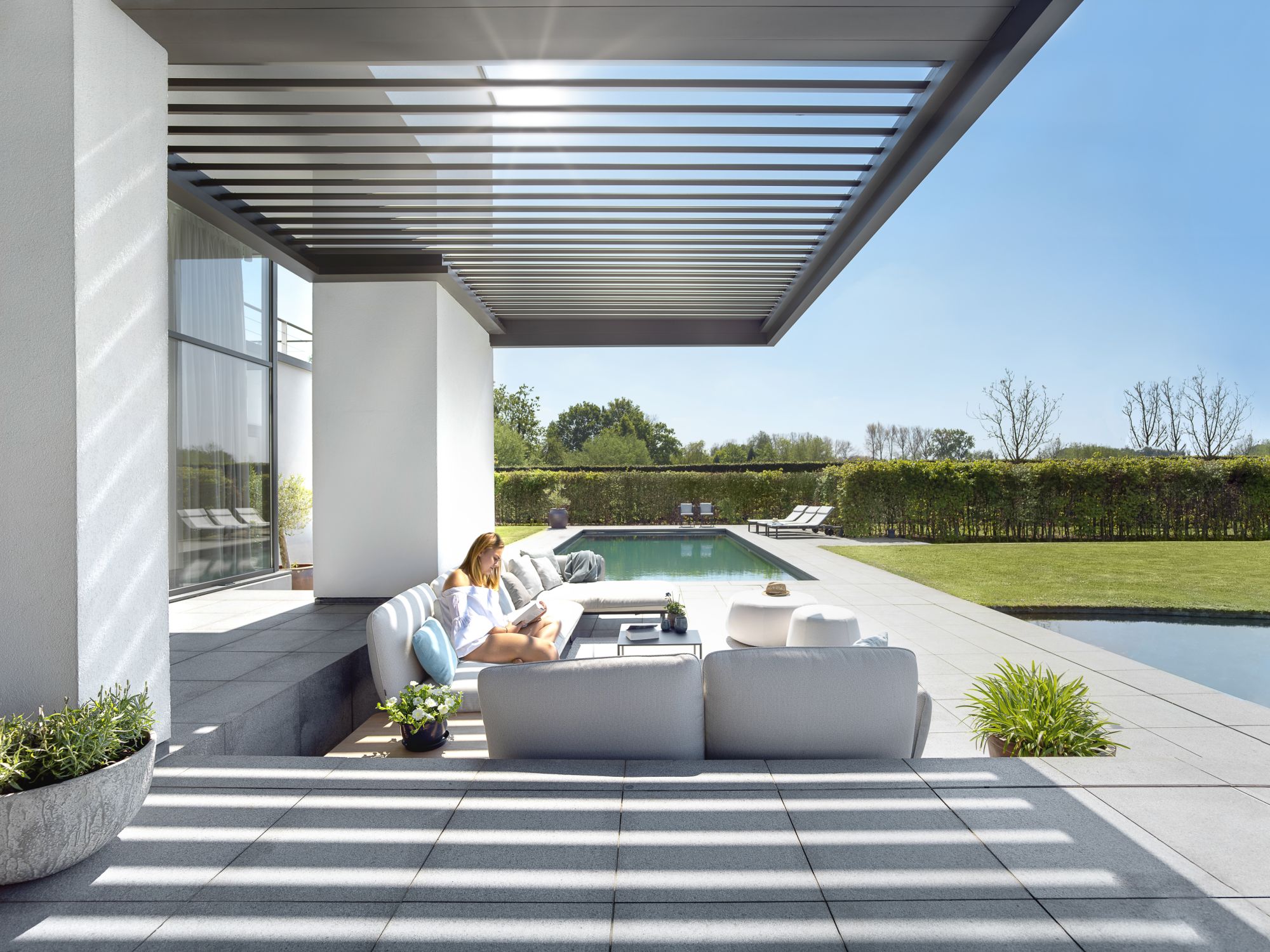 Ses poteaux d’une finesse exceptionnelle, carrés ou ronds, dessinent une présence discrète et élégante, laissant l’architecture s’exprimer pleinement. Umbris ne se contente pas de protéger, elle révèle votre espace extérieur et transforme la lumière, l’ombre et les volumes en une expérience unique, parfaitement intégrée à votre lieu de vie.